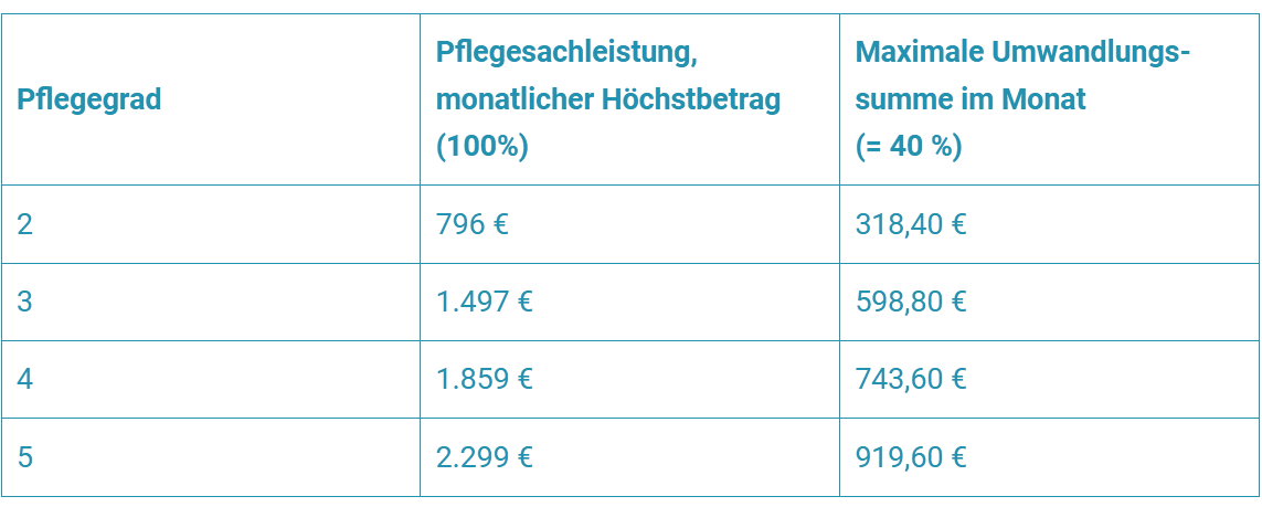 Die Höhe Ihrer Pflegesachleistungen, auf die Sie Anspruch haben, wird durch Ihren Pflegegrad bestimmt. Daher hängt auch der höchstmögliche Umwandlungsbetrag von Ihrem Pflegegrad ab.
